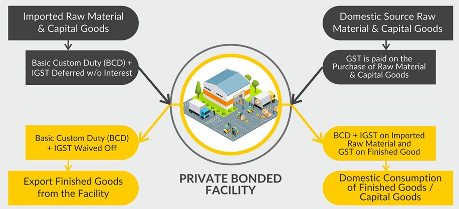 - Single Approval & Form: A single application cum approval form simplifies the process for obtaining a license for a private bonded facility and permission for manufacturing and other operations.