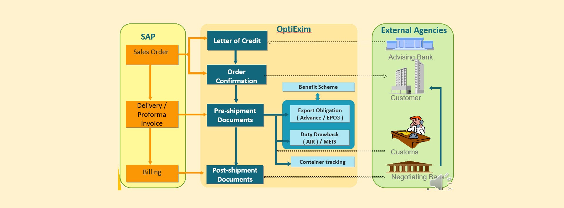 OptiEXIM is a powerful, easy to use platform that provides a single point of access to your trade finance documents from an aggregated bank import payment request. With OptiEXIM, you can generate export documentation (export bill) in seconds with little or no investment in technology and then track it with ease right through to end-to-end processing.