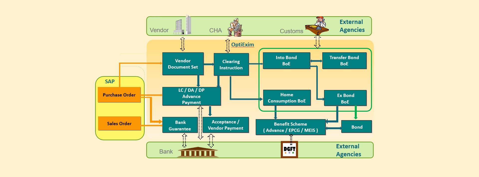 IVL has more than two decades of experience in designing SAP Certified Add-ons (Opti range of products). OptiExim handles the scenarios based on current Foreign Trade policy/ regulations 2023 The solution architecture uses native SAP transactions, SAP Enterprise portal & SAPUI5/Fiori applications. OptiExim can be easily integrated with external applications, government portals using APIs